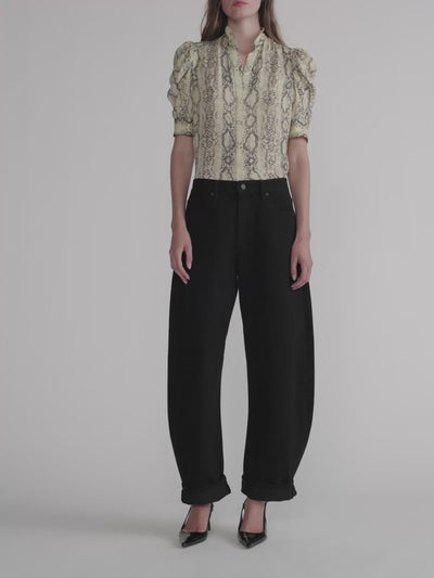 An exaggerated take on the trending barrel silhouette, this unique fit is your new closet necessity. With a flattering high rise, these jeans feature a curved outseam for a playful bubble effect. Designed to be worn cuffed and hit at the ankle, the 2.5" twice-rolled cuff can be unrolled for a longer, more dramatic inseam.