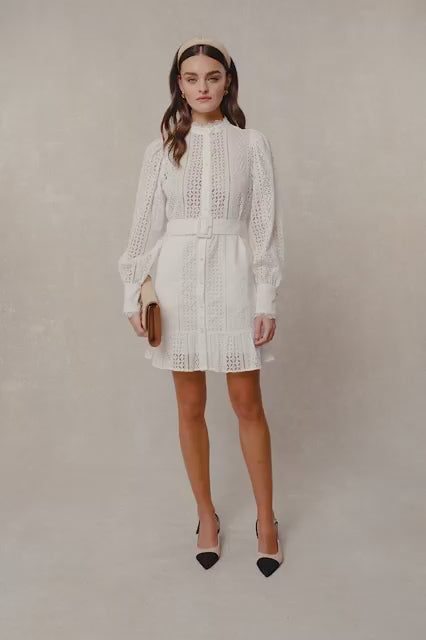 Collarless Broderie Mini Dress - White