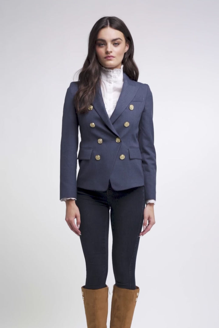This double breasted blazer from Holland Cooper is a chic trans-seasonal wardrobe essential. Designed to create a sharp tailored silhouette worn open or closed. Fully lined with a luxury stretch lining for extra comfort and adorned with HC signature Gold buttons on the front and cuffs.