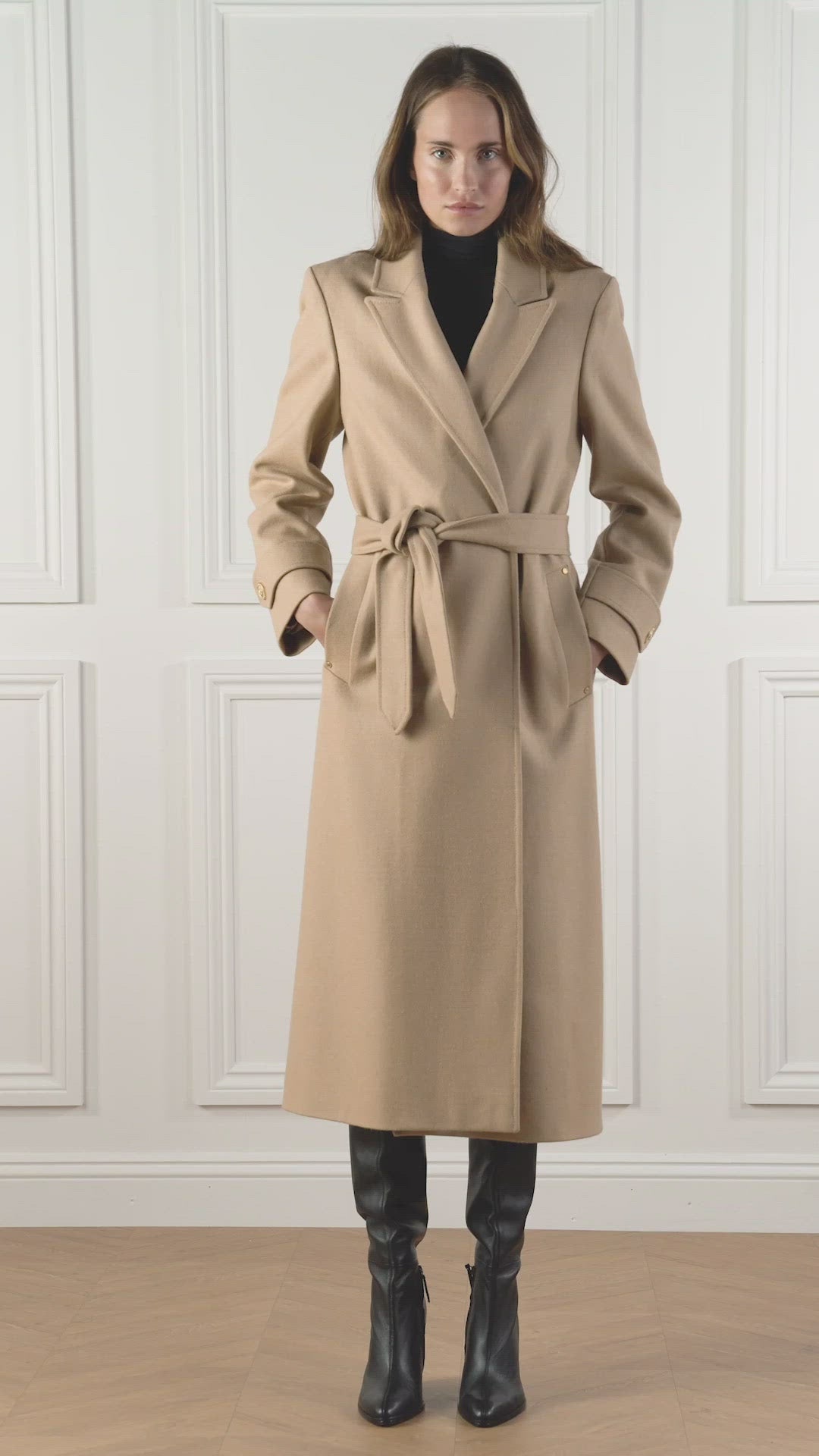 The Wrap Coat provides a flawless blend of understated style and elegance. This fitted, full length coat wears style to every occasion. It has a relaxed wrap silhouette that can be defined with the tie belt. This coat has been hand cut and made entirely in England using wools woven in the UK.