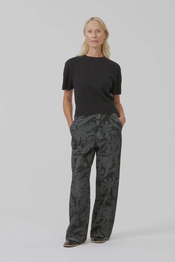 The Silhouette Top features a standard fit with dropped shoulders, a crew neck and displaced shoulder seams. A fitted ribbed hem cinches the waist, creating a cropped length and adding a sculptural touch. Crafted from organic cotton and knit in a fine single jersey stitch.
